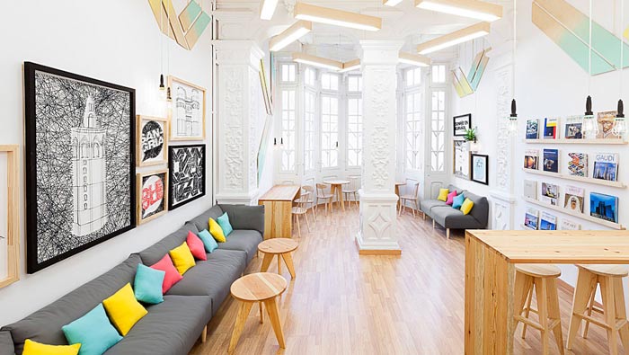 培訓機構辦公室辦公進門區設計:此次不僅提供休息,同時也承擔起接待的作用,家長、孩子、老師坐在此處相互交談,彼此了解對方,這樣的設計為雙方營造了一個不錯的交流氛圍。