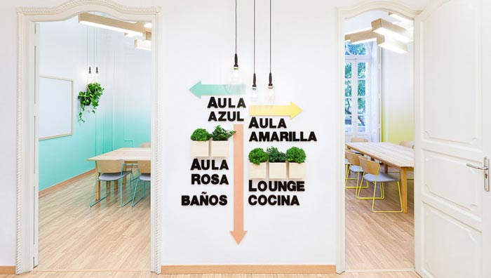 培訓機構辦公室導引區設計:其實說起來此處只是一堵墻,但是設計師為其增添了不一樣的風情,箭頭的出現填補了大家的語言空白,通過箭頭的分布可以大致了解辦公空間的基本格局。