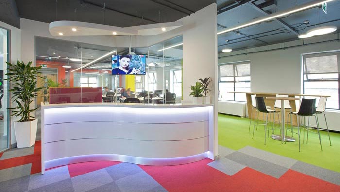 科技公司辦公室前臺區設計:設計師在設計的時候,考慮到如何將前臺從整個空間中脫離出來,因為整個空間是以長方形進行分布,最后設計師采用一個弧形的玻璃隔斷將前臺空間與其他區域進行隔離,同時接待區域的分布也恰到好處,保證兩個空間之間的融合,避免出現單一化。