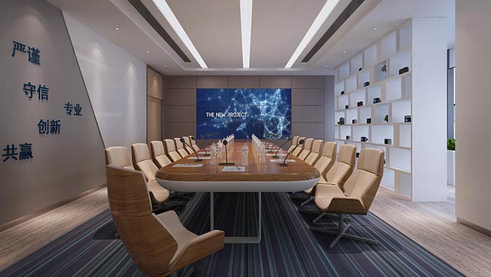 科技辦公室會議室設計:會議室簡潔、大氣的設計,更能滿足企業(yè)對于會議室的需求,墻面嚴謹、守信、專業(yè)、創(chuàng)新、共贏,體現(xiàn)了企業(yè)文化特征,咖啡色的會議桌彰顯高雅。