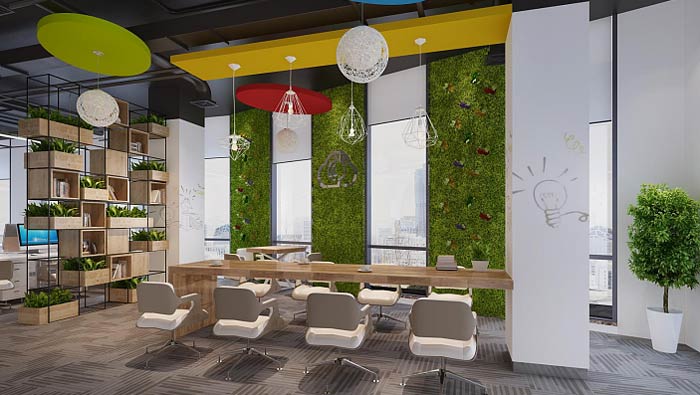 科技辦公室休閑區(qū)設計:休閑區(qū)采用簡單的造型、與色彩相互搭配,使的整個空間高效、嚴謹,休閑空間有休閑、辦公兩種屬性,綠植墻的出現(xiàn),是為了減輕長時間看電腦的視覺疲勞。