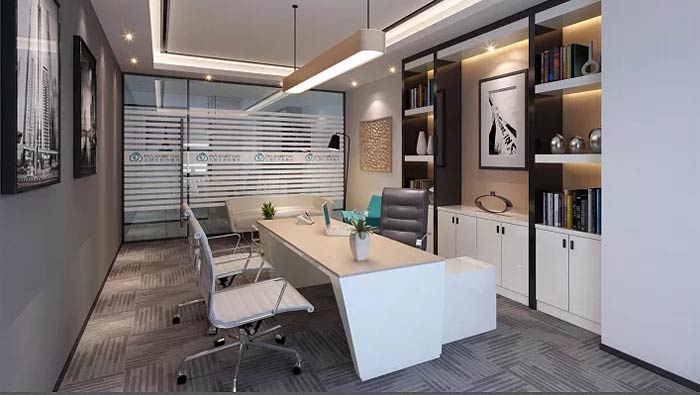 科技經理辦公室設計:整個空間的設計關鍵詞就是簡約、時尚,色彩使用黑白灰三種色系,頂面做了簡單的石膏板裝飾,吊燈采用條文吊燈,整個空間的設計意在高效二字。