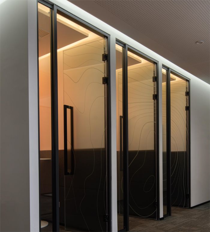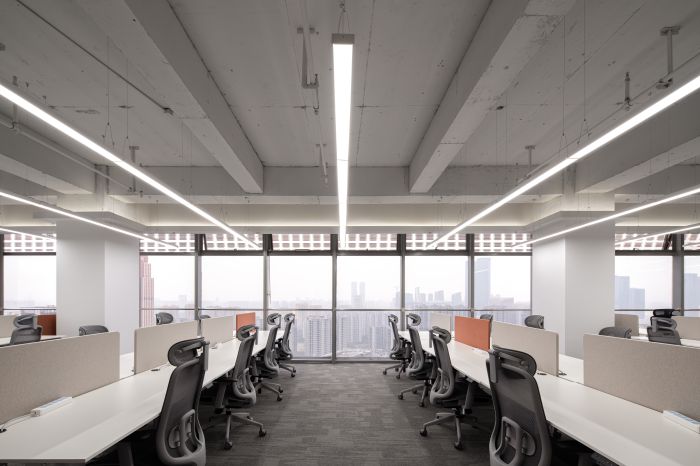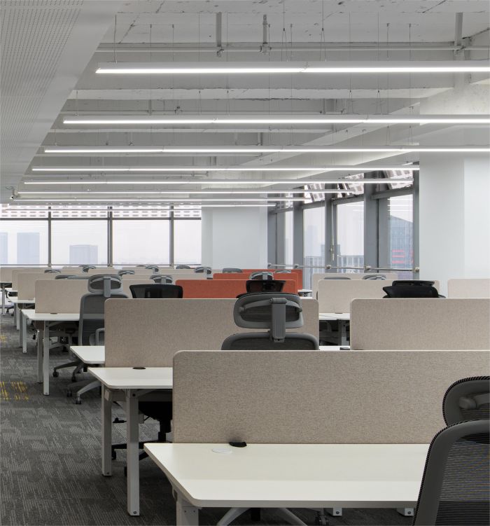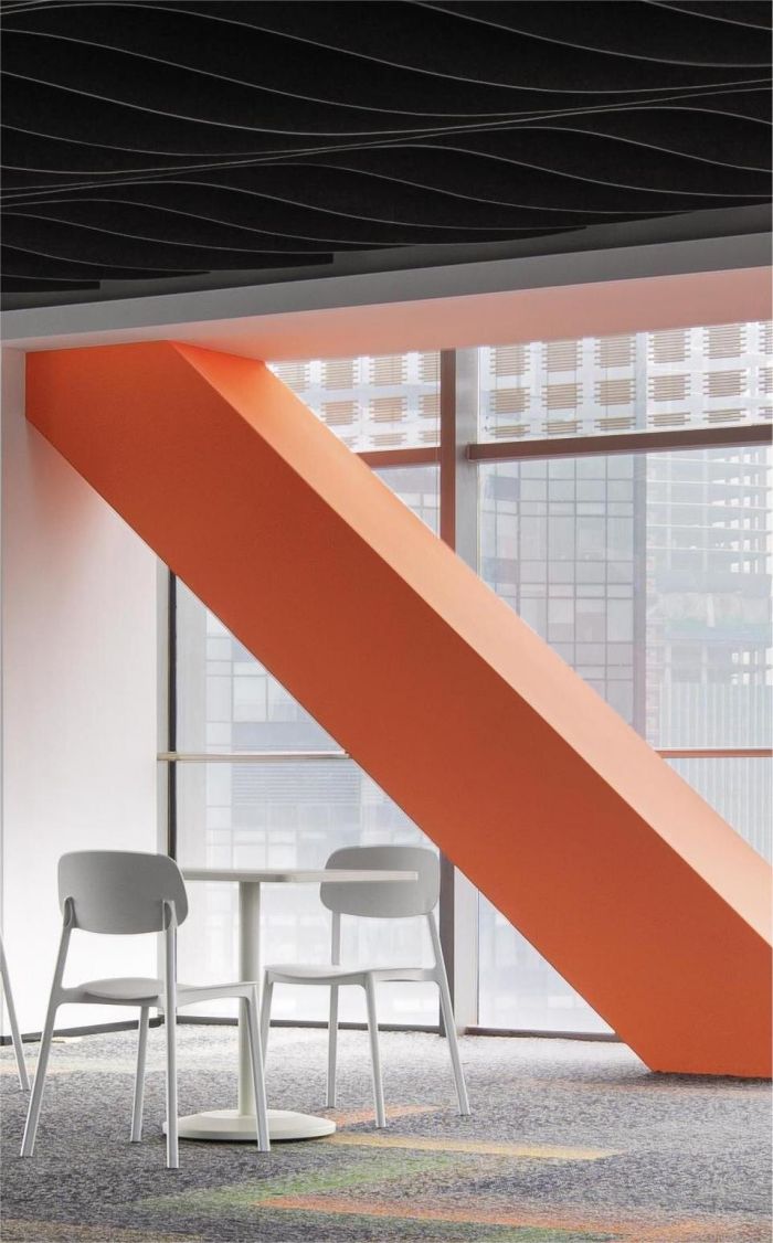 空間的一角設置有員工休息區(qū),員工可以在這個空間里休息和討論,桌椅的不同組合讓這個空間也可以作為大型培訓的場所。空間內(nèi)有一個橙色的V字,是對空間原有建筑的延續(xù),使得整個空間靈動。