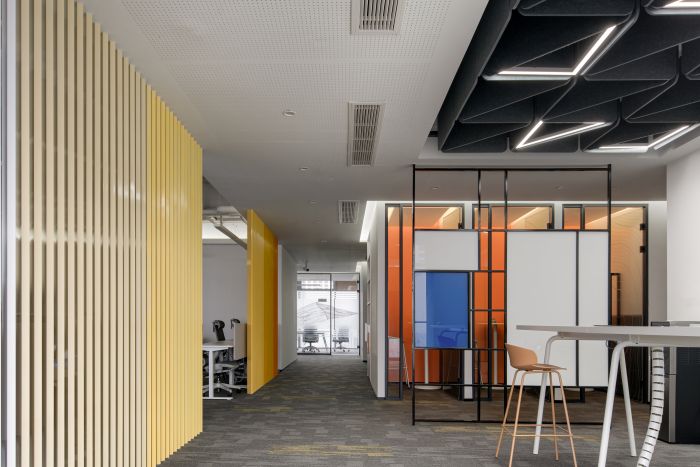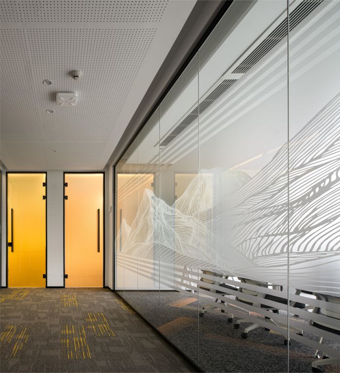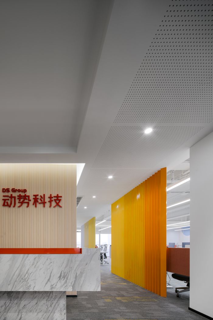 前臺空間使用了白色大理石材質(zhì),整體風格簡潔優(yōu)雅。空間右側使用企業(yè)的品牌色黃色和橙色設置了一個線條隔斷,用于分隔入口區(qū)域和辦公區(qū),保護企業(yè)辦公空間的隱私。空間讓來訪者感覺流暢現(xiàn)代,同時也充滿了企業(yè)的個性。