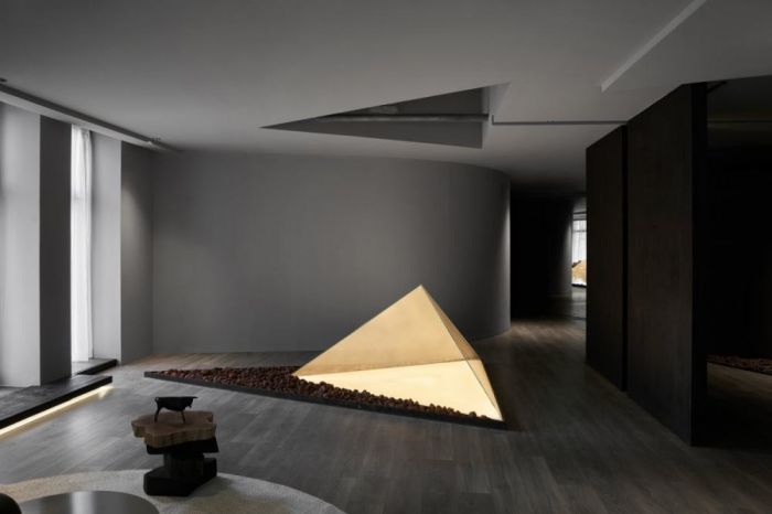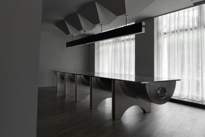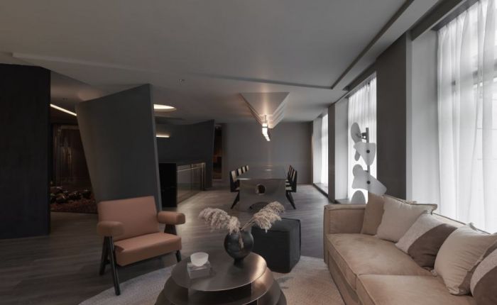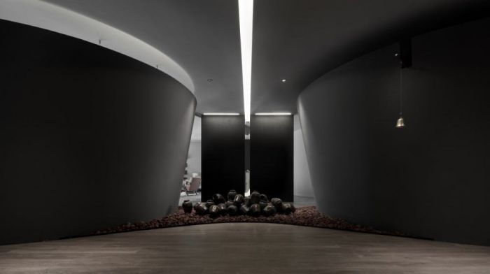 這是位于杭州公元大廈的國立酒業(yè)辦公會客廳的空間設計。空間結合了辦公和會客的功能需求,特別強調(diào)在白酒公司的工作環(huán)境中融入酒文化的精神需求。設計師從“酉”字的象形概念出發(fā),通過空間布局和形態(tài)學的應用,創(chuàng)造了一種流動且富有層次的室內(nèi)環(huán)境,有效區(qū)分并聯(lián)系了公共會客廳和私密辦公區(qū)域。