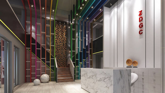前臺區域的設計,設計師在設計的時候,重點在于表達動線的完善對于企業的重要性,在設計師看來經過樓梯的雙邊設計,可以有效的進行節流,讓客戶可以井然有序的進入企業空間,在此也變相的說明了動線對于空間的重要性。