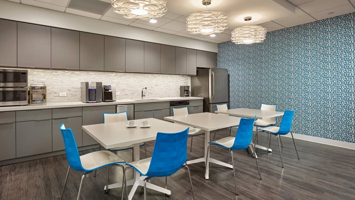 辦公室茶水間設計:冰箱、微波爐、洗手池、咖啡機、收納柜構成了茶水間的基本框架,可移動的休息座椅保證空間的活躍性,在這樣員工可以遠離壓力,讓自己的勞累的心得以歸零。
