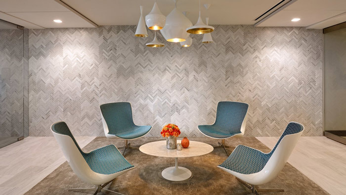 辦公室接待區(qū)域設計:此處與前臺空間在一個空間之中,因為地毯的原因讓其區(qū)別于整個空間,四個座椅的擺放剛好形成一個圓形,在使用上更有利于溝通,在寓意上有圓滿的意味在其中。