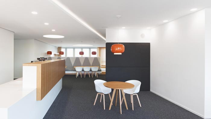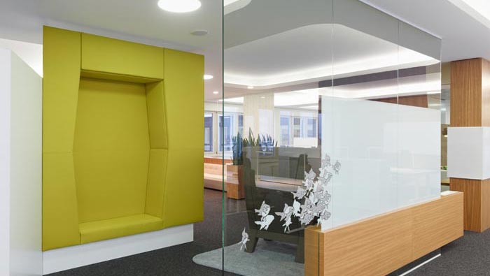 軟件公司辦公室入門區設計:設計師在設計的時候,對每一個空間都進行了無數次的搭配,在設計師看來一個設計的好壞,往往從細節上可以感覺出來,此處就是一個明證,一小塊圓形地毯+創意沙發就完成了一個區域的建立,真是讓人嘆為觀止。