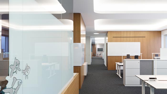軟件公司辦公室辦公區設計:設計師在設計的時候,在采用開放式辦公的同時,以儲存柜代替隔斷將每一個辦公工位進行隔離,這樣的設計可以有效的彌補開放式的缺點,同時讓空間看起來更加有層次感,儲藏柜的設置也很好的解決了空間容納的缺憾,真是一舉兩得。