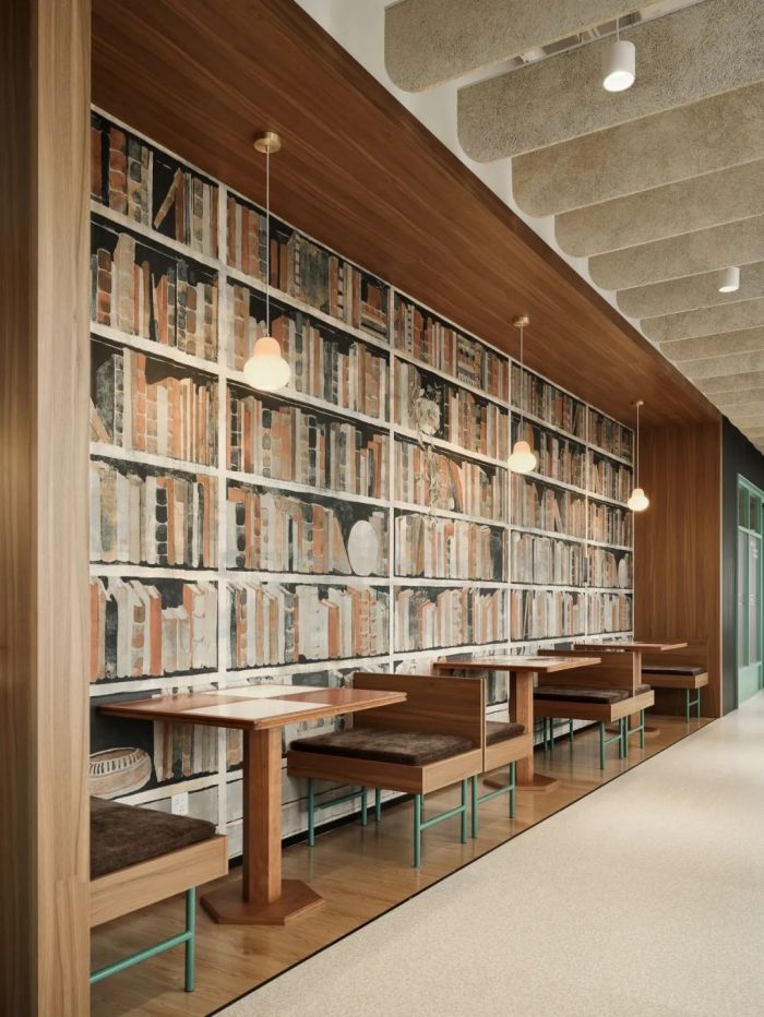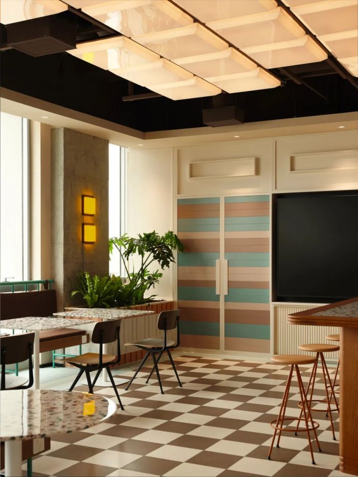 其次是精神補(bǔ)給的CULTURE(文學(xué))和INTEREST(興趣)層。文學(xué)層以“書頁(yè)”形式做了頂燈和壁燈設(shè)計(jì),柔和的燈光、墨綠的墻面宛若置身圖書館。興趣層的趣味性較強(qiáng),色彩也更溫馨明亮。
