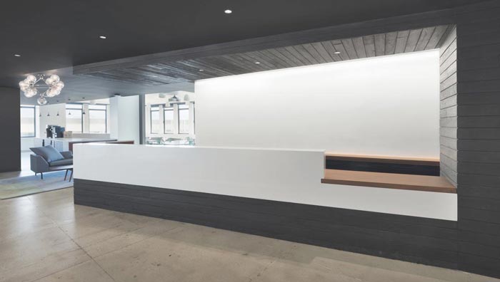 前臺區域的設計:此處給人的第一感覺好像是進入到電影里面一樣,四周是黑色的邊緣,中間是白色的裝飾墻與軟裝,讓我們有種進入到虛擬世界的感覺,這也是設計師希望讓客戶感受到的效果,因為對于企業來說,自身的實力與客戶的實際體驗同樣重要。