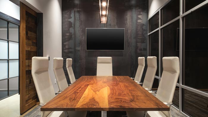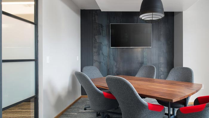 700平方辦公室會議室設(shè)計:此處的空間為長方形格局設(shè)計,設(shè)計師為了將空間的效果發(fā)揮到最大,故此采用移動式的設(shè)計,每一個會議桌下面有一個一個滑輪,合則形成大會議室、分則各自為戰(zhàn),這也是設(shè)計師對此處的詮釋,同時此處與落地窗相鄰,白天時陽光照入室內(nèi),讓整個空間明亮無比,當(dāng)黑夜襲來的時候,空間變成了一個暗色系的空間,不同的情景給以不同的場景。