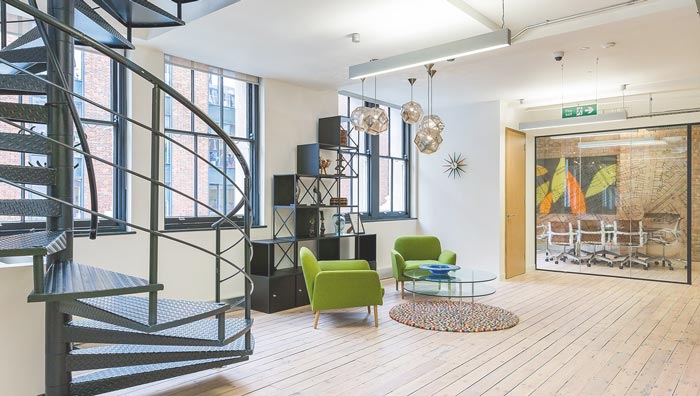 900平方辦公室進(jìn)門(mén)區(qū)設(shè)計(jì):當(dāng)客戶(hù)進(jìn)入空間之后,第一眼看到的就是旋轉(zhuǎn)的樓梯,這樣的樓梯給人一種復(fù)古的感覺(jué),但在設(shè)計(jì)師的設(shè)計(jì)手法之下,變得是那么的自然,讓空間復(fù)古的氛圍更加的自然,接待桌椅的擺放為空間加入了現(xiàn)代的元素,讓空間變得簡(jiǎn)約又有韻味。