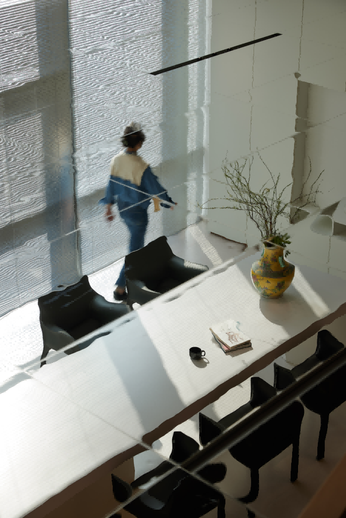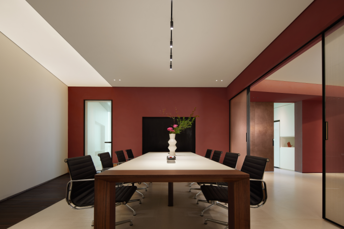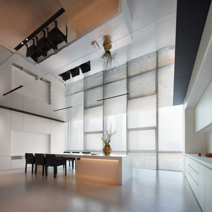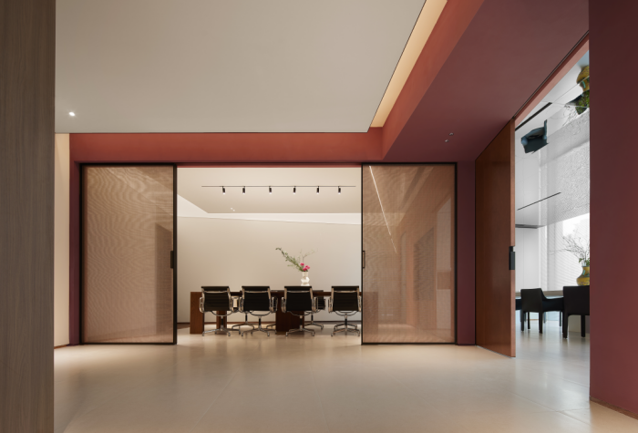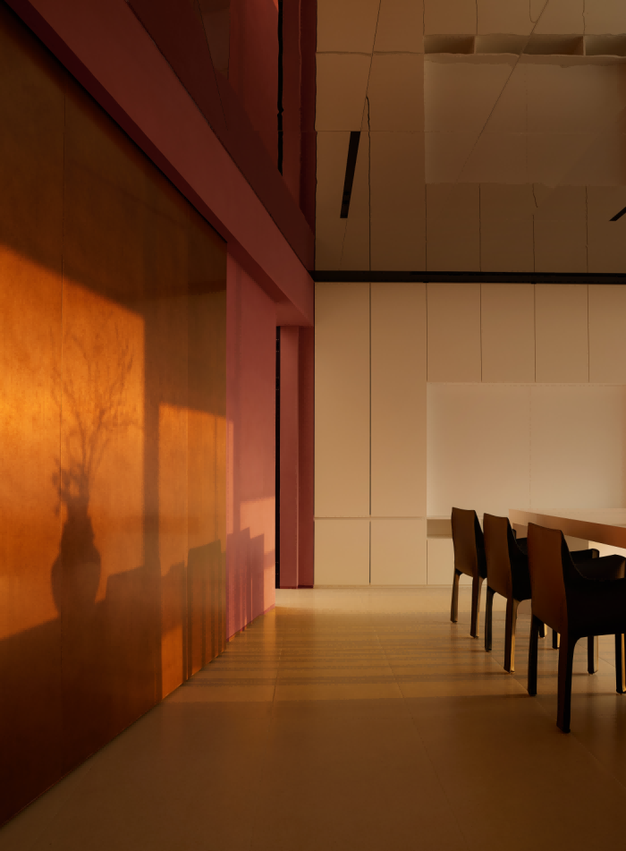 辦公室不同于尋常的辦公空間,以體驗式的空間形態(tài)呈現(xiàn),情緒逐漸由外至內(nèi)轉(zhuǎn)變,變得安靜柔和。在感知層面,設(shè)計師通過設(shè)置明顯斜角和落地窗前的斑駁光波反射,增加空間的層次感和立體感。在視覺層面,設(shè)計師通過斜面的設(shè)置和不同材質(zhì)的運用,改變空間的視覺效果,增添更多表現(xiàn)力和質(zhì)感。在敘事層面,設(shè)計師通過創(chuàng)造一個有趣的空間邏輯,將生活融入空間的細節(jié)中,讓使用者自主發(fā)現(xiàn)。