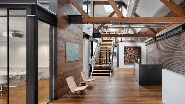 辦公室前臺(tái)區(qū)設(shè)計(jì):設(shè)計(jì)師將前臺(tái)與樓梯結(jié)合在一起,就是希望客戶在經(jīng)過(guò)前臺(tái)之后,可以直接通過(guò)樓梯進(jìn)入二樓,對(duì)空間的大致格局有一個(gè)直觀的了解。
