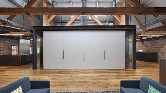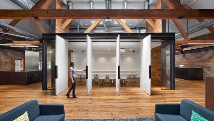 辦公室會(huì)議室設(shè)計(jì):當(dāng)活動(dòng)門(mén)打開(kāi)以后,會(huì)議室展露在大家面前,由此不得不佩服設(shè)計(jì)師的想象,這也是設(shè)計(jì)師的設(shè)計(jì)之道,讓空間活動(dòng)起來(lái)。