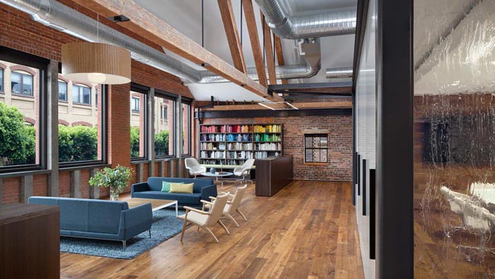 辦公室接待區(qū)設(shè)計(jì):此處保留了紅色磚,歷史的味道充斥在空間之中,讓客戶感受到那逝去的歲月,以此引起與客戶之間的共鳴,書(shū)柜的設(shè)計(jì)在空間盡顯書(shū)香氣息。