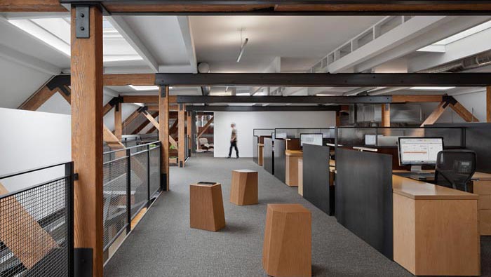 辦公室二樓過(guò)道設(shè)計(jì):設(shè)計(jì)師在設(shè)計(jì)中受到軟裝便捷的啟發(fā),采用獨(dú)立座椅,擺放在空間之中,既不影響交談,也開(kāi)辟了一個(gè)新的使用空間。