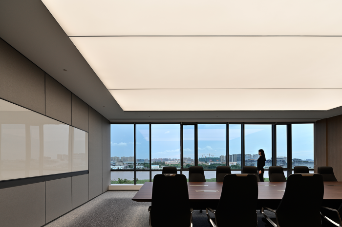 項(xiàng)目主體為開放式的辦公空間,包含若干會(huì)議室、培訓(xùn)室、洽談室,空間整齊通透(幾乎都是玻璃隔斷),并把最美的北側(cè)江景視線讓給員工。