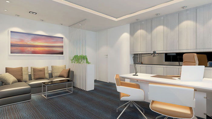 總經理辦公室開敞明亮,黑色沙發,灰色地毯,融合了現代簡約主義理念,空間在訴說屬于原始、清新的美。