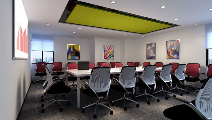 會議室的設計,設計師看來主要就是調動員工區域積極的思考,在設計的時候設計師采用色彩之間的變化,為企業提供了很好的思考與討論空間。