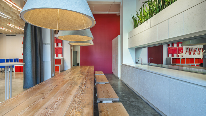 茶水間的設計:白色的茶水臺將茶水用具都涵蓋在其中,讓墻與茶水臺合為一體,這樣設計的好處就是讓空間得到合理的開發與利用,在設計師的想法當中,希望讓員工在這里可以相互交流,故此設計師在此次安排了一個交匯場所,目的就是希望讓員工在此處匯合彼此交流心得。