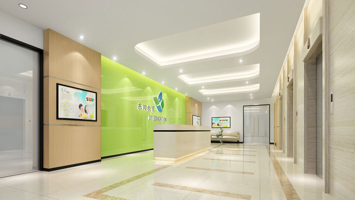 前臺的設計,設計師采用大幅度淺綠色做為背景色,淺綠色是明亮、淡雅的顏色,淺綠色充滿了生命力的色彩,表現了萌芽發展初期時候的色彩,在此處表示教育啟蒙是在合適不過了。