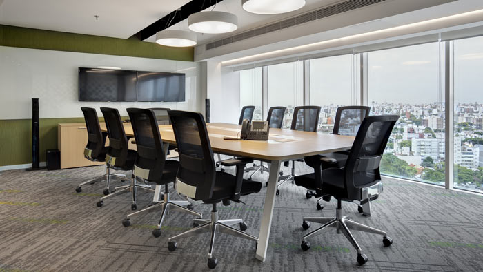 辦公會議室裝修效果圖:由顏色框定的會議空間,正是設計師為企業專門定制的,這樣可以減少隔墻對空間的影響,斜放的會議桌椅,讓空間不會那么呆板。