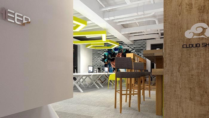 700平方設(shè)計(jì)事務(wù)所辦公室前臺(tái):在設(shè)計(jì)的時(shí)候,設(shè)計(jì)師采用貓眼的模式對(duì)空間進(jìn)行設(shè)計(jì),以此讓客戶在進(jìn)入空間后對(duì)企業(yè)內(nèi)部有一個(gè)直觀的認(rèn)識(shí),前臺(tái)在空間中被設(shè)計(jì)師隱藏,首先空間與空間的自然轉(zhuǎn)變。